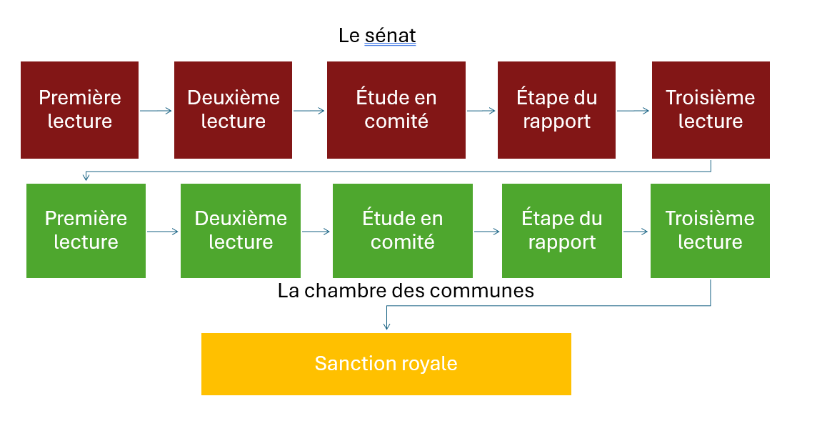 Le processus législatif au sein de chacune des Chambres du Parlement comprend cinq étapes : la première lecture, la deuxième lecture, l’étude en comité, l’étape du rapport et la troisième lecture. Chaque lecture se conclut par un vote au cours duquel les parlementaires décident si le projet de loi doit passer à l’étape suivante ou être rejeté et retiré de l’examen. Le parrain d’un projet de loi dans chaque Chambre est responsable de demander un vote lorsqu’il ou elle souhaite passer à la lecture suivante ou procéder au vote final sur le projet de loi.